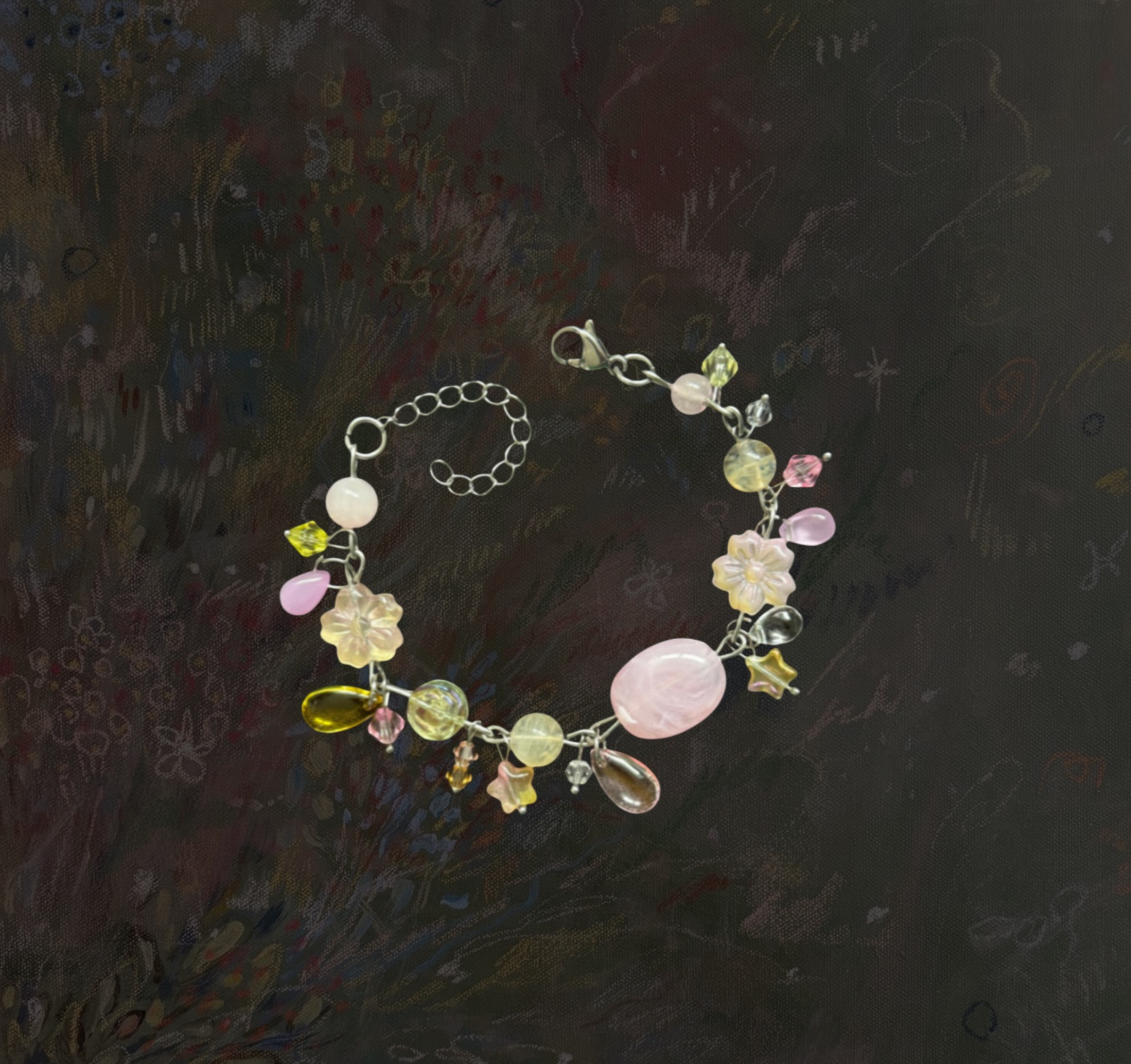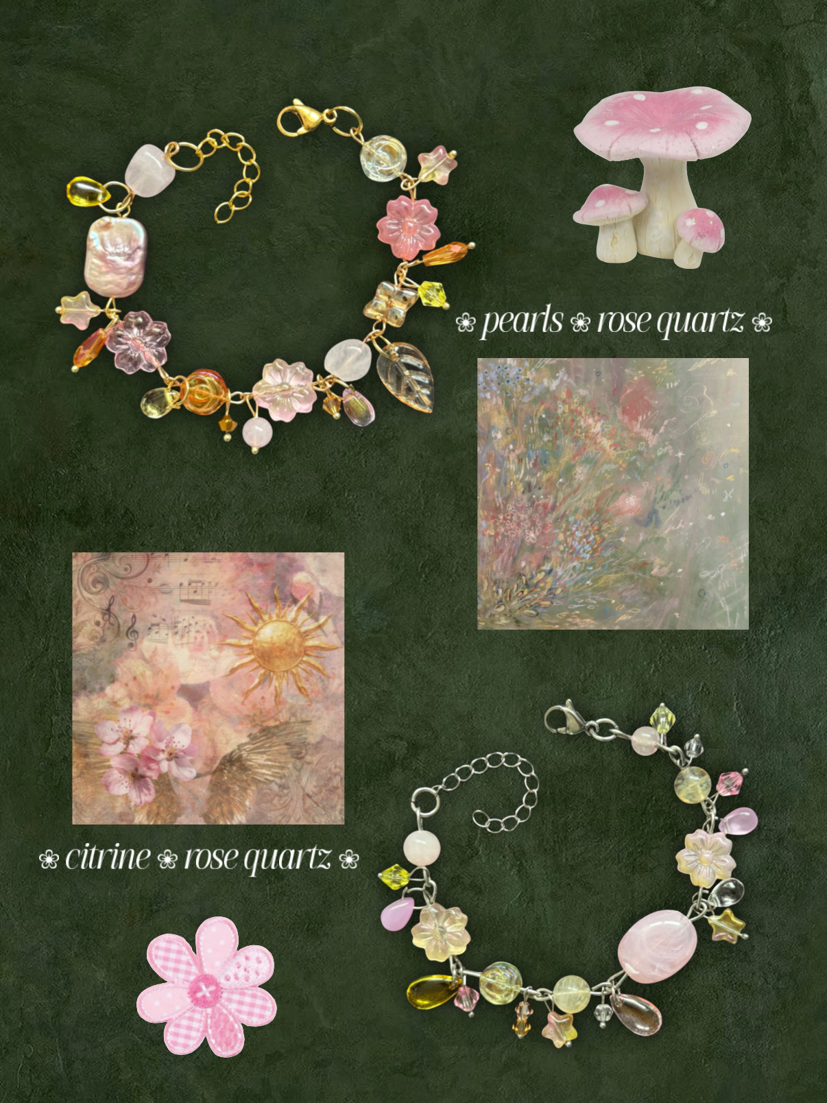 Táto kolekcia jarných náramkov je tvorená z chirurgickej ocele a doplnená o rôzne minerály, akrylové korálky a sklenené korálky. Každý náramok je ručne zostavený tak, aby pripomínal malé jarné zátišie – plné kvetov, listov a jemných detailov.