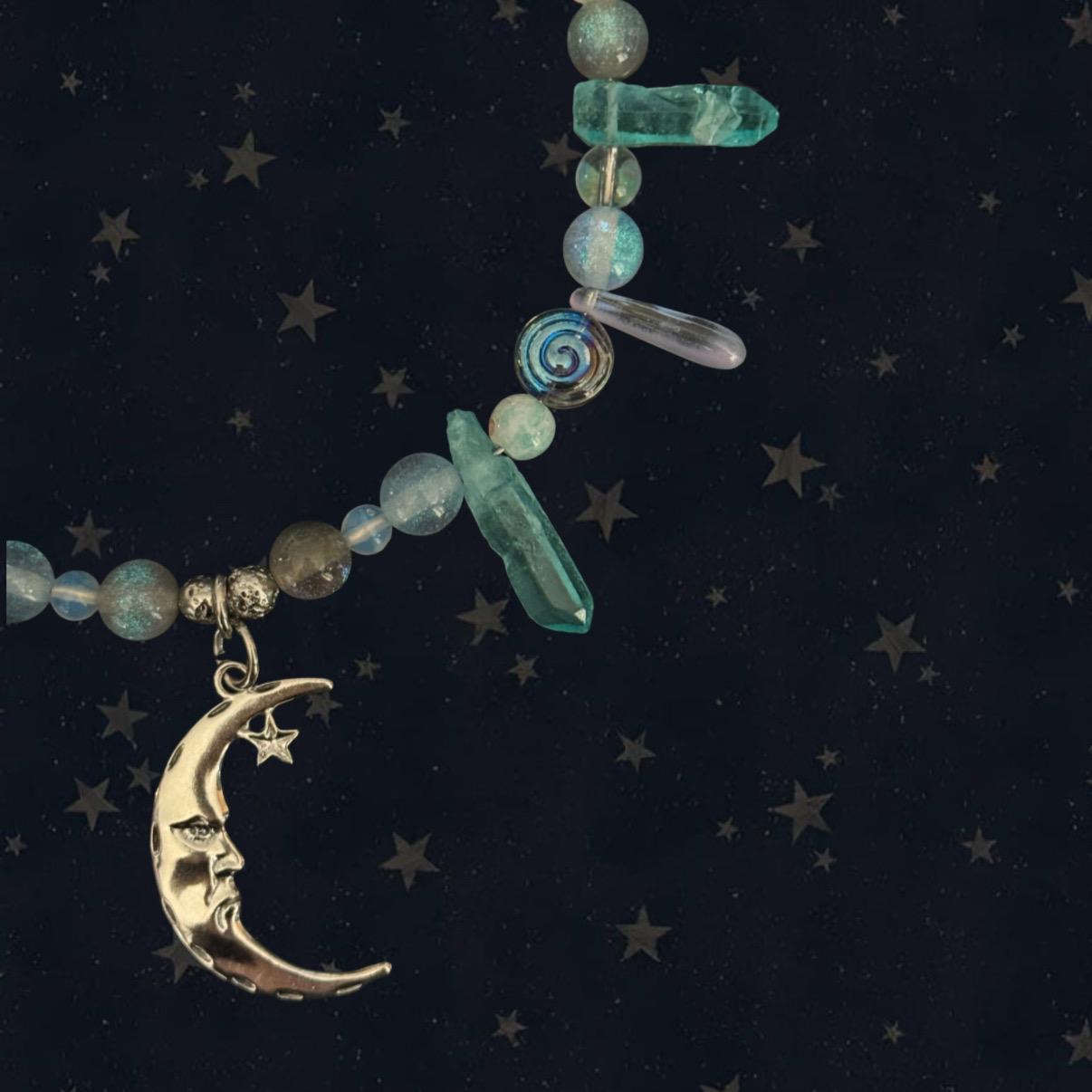 Tento náhrdelník nesie jemnú lunárnu energiu – symbol intuície, vnútorného pokoja a cyklov, ktorými v živote prechádzame. Mesiac v strede šperku pripomína spojenie s naším vnútorným svetom, emóciami a schopnosťou načúvať vlastnej intuícii.