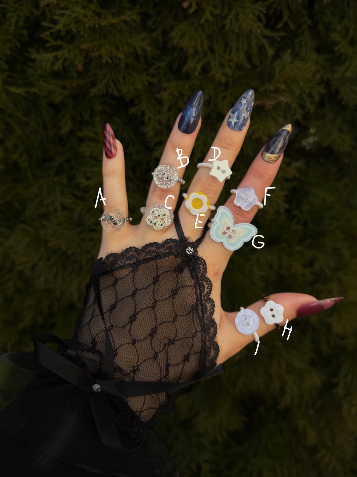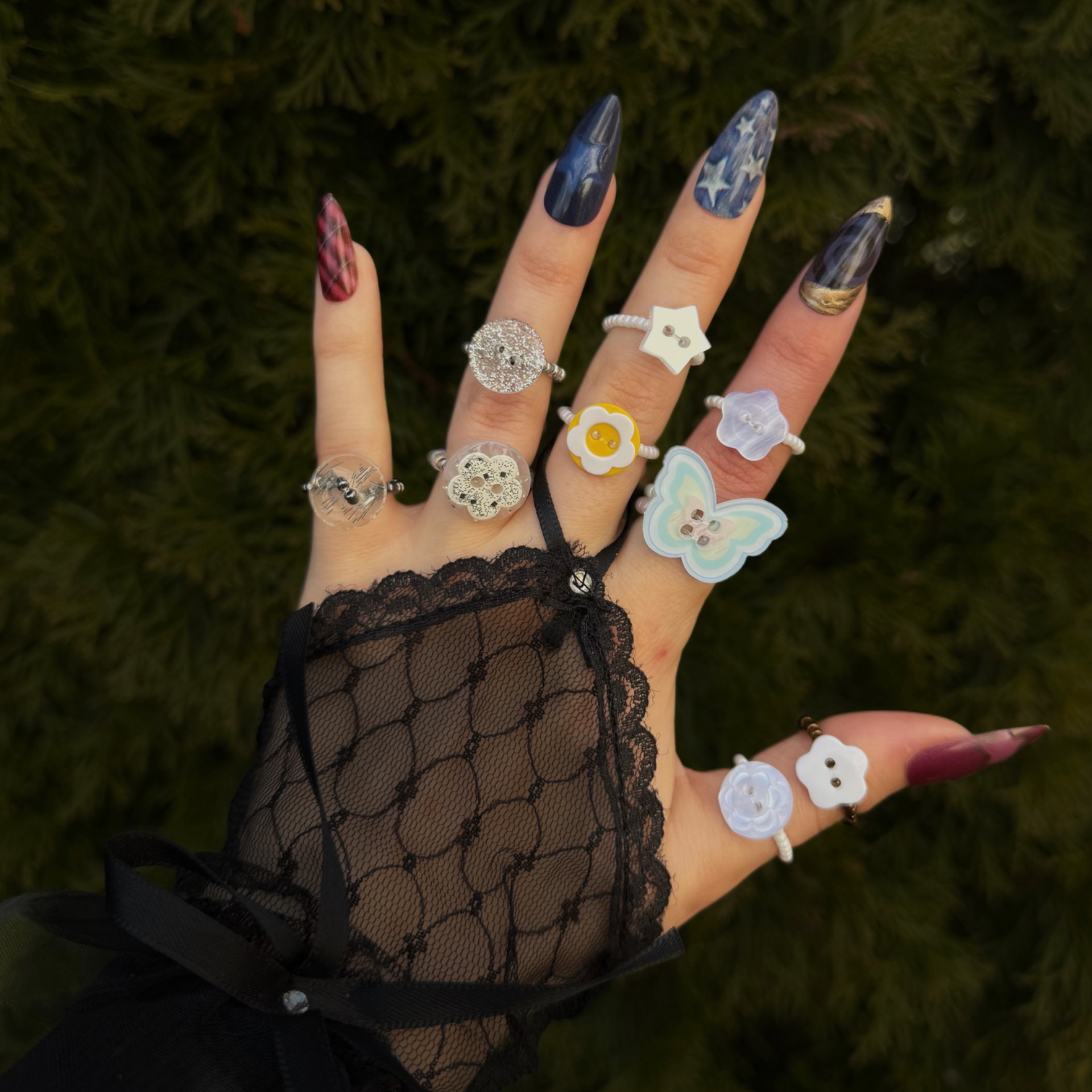 These rings are made from decorative buttons, Czech beads and elastic beading cord, which allows the ring to stretch and comfortably fit most finger sizes.
