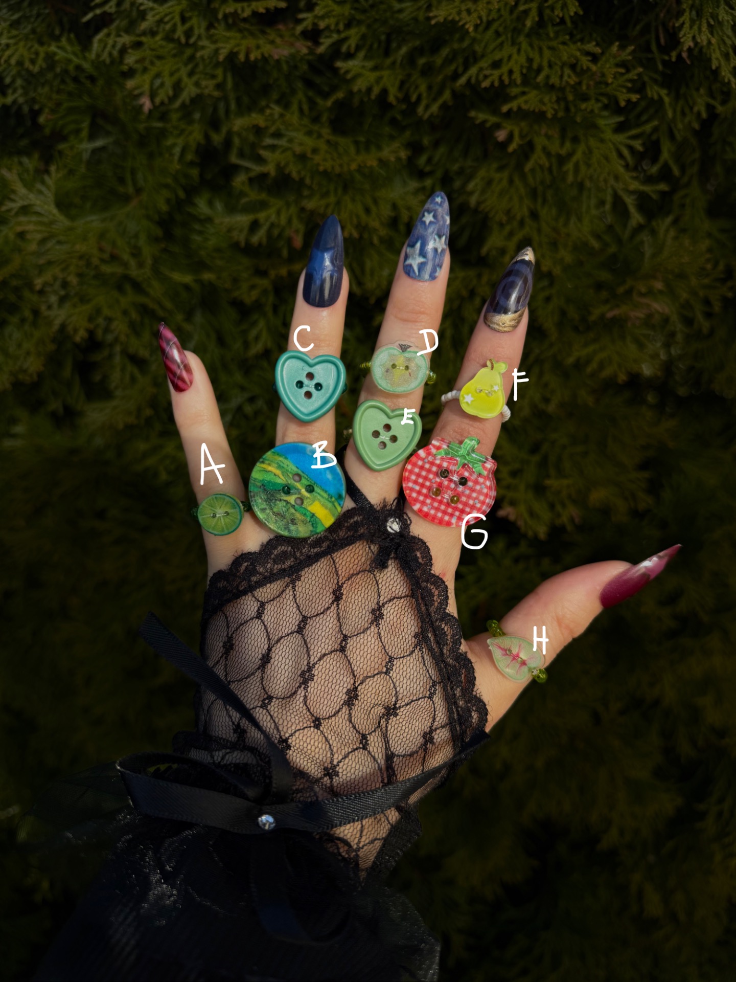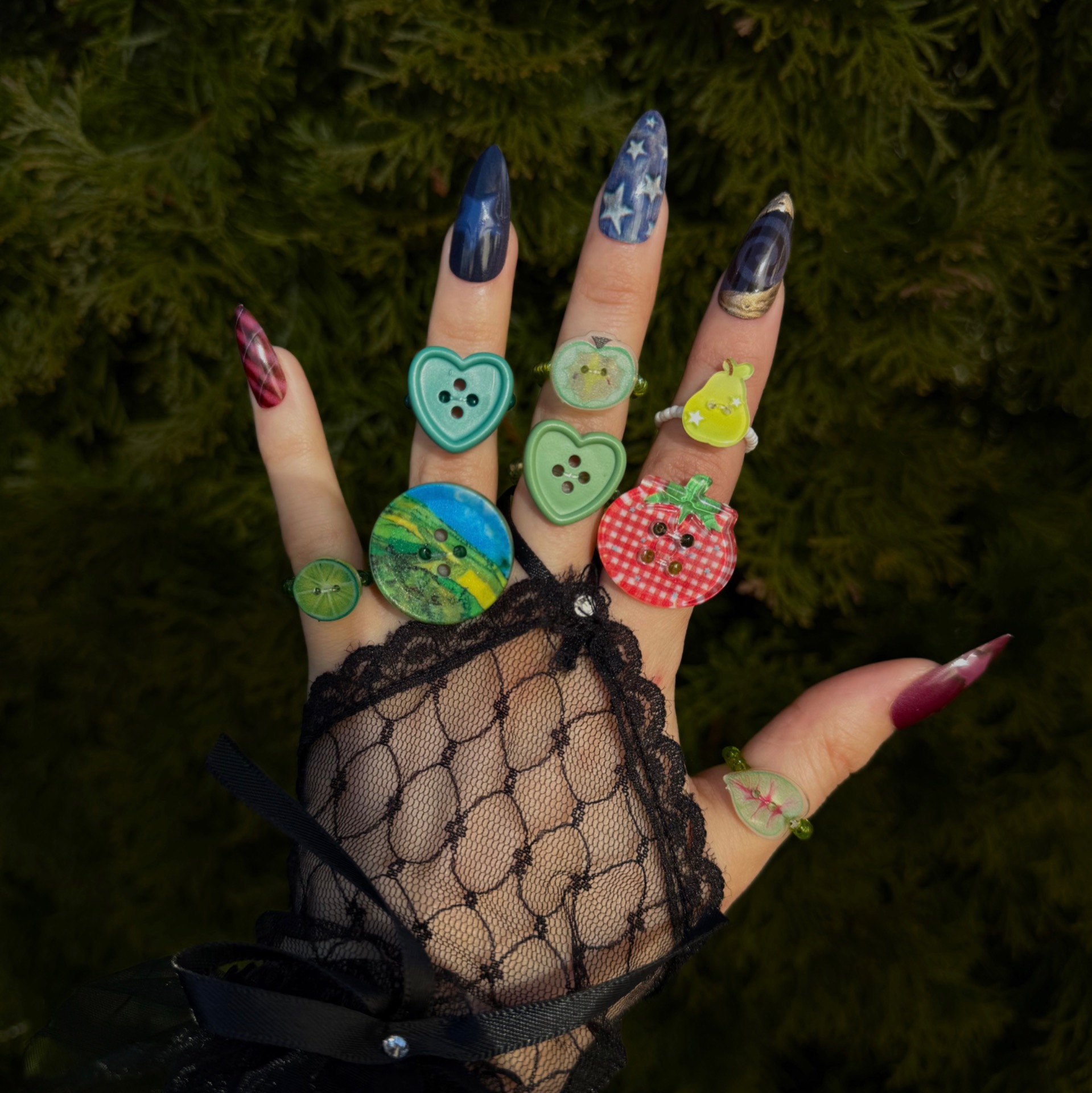 Tieto prstienky sú vyrobené z rôznych dekoratívnych gombíkov, českých koráliek a pružného elastického silónu, vďaka čomu sa prispôsobia väčšine veľkostí prstov.